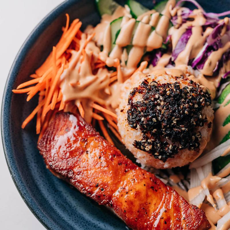 Jasmine rice, chili crunch oil, red cabbage, cucumber, avocado, daikon, radish, carrots, yum yum sauce, ginger soy.